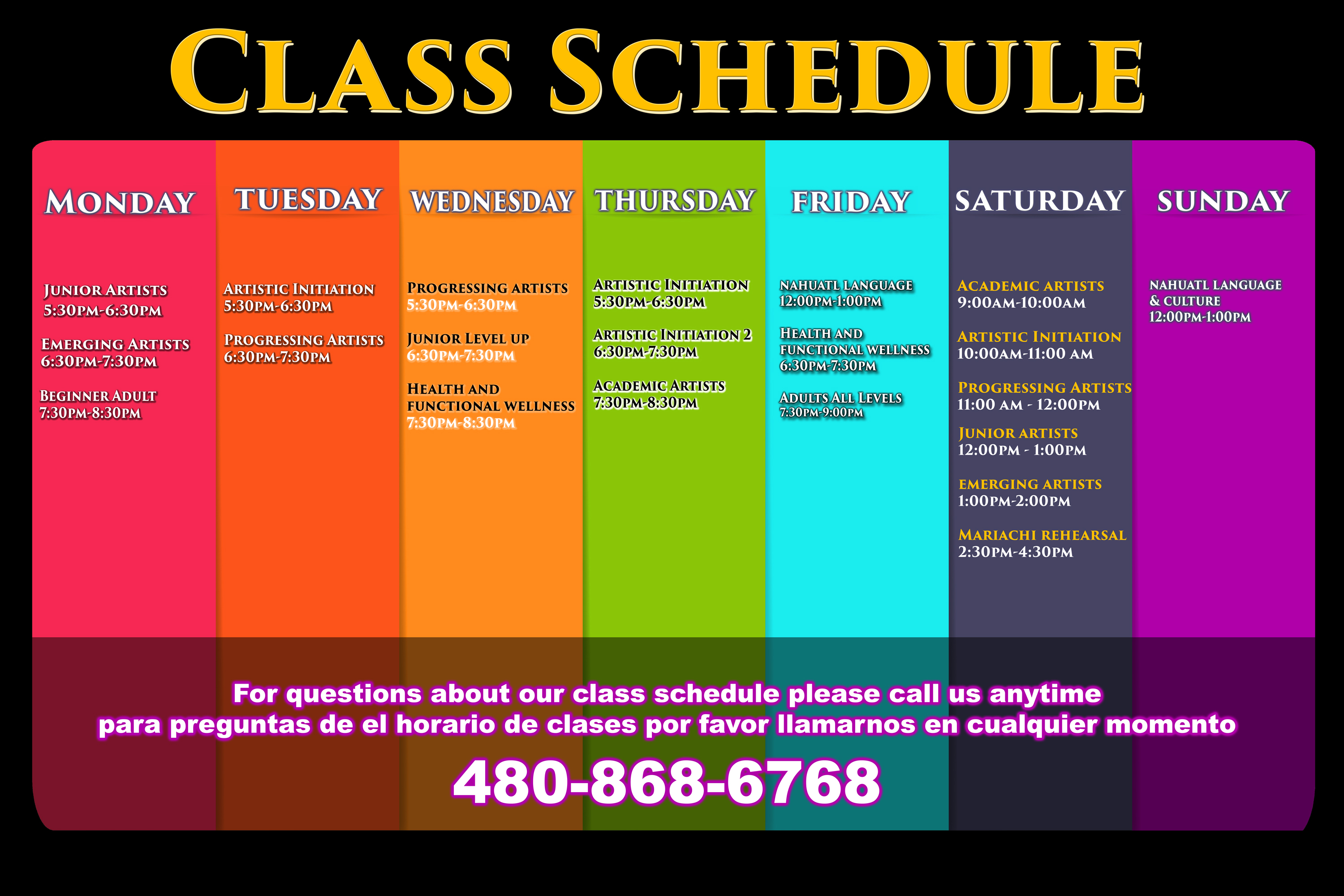 Below you will find our current class schedule for Mexican Folklore Dance, Mariachi Music Academy, and our Nahuatl Language Program.